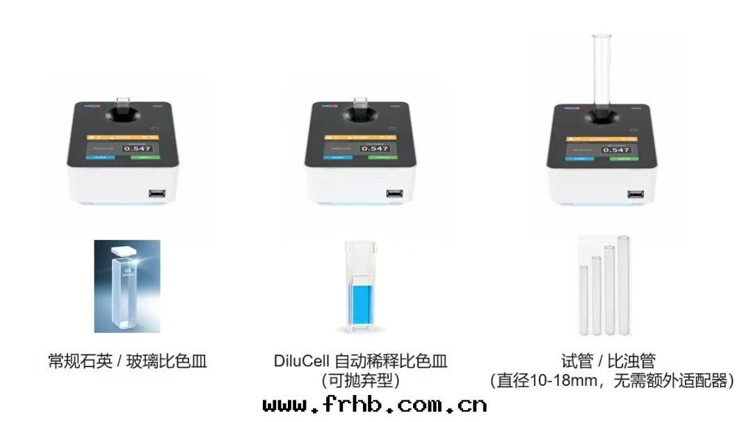 广泛的(de)樣(yàng)品容器兼容性(xìng)是(shì)新(xīn)款OD600的(de)特点,可(kě)使用(yòng)普通(tòng)/狹缝石(dàn)英比色(sè)皿,玻璃比色(sè)皿,塑料比色(sè)皿,還(huán)可(kě)以直(zhí)接放(fàng)置10-18mm規格的(de)試管(guǎn),无需使用(yòng)額外(wài)的(de)适配器,通(tòng)过(guò)靈活的(de)彈片(piàn)式夾具,即可(kě)适配上(shàng)述所(suǒ)有(yǒu)規格容器。这(zhè)当然也(yě)包(bāo)括Implen原裝(zhuāng)的(de)DiluCell自(zì)動(dòng)稀釋比色(sè)皿,通(tòng)过(guò)光(guāng)程設計(jì),可(kě)进行10倍的(de)虛拟稀釋,简化(huà)了(le)菌液OD测量(liàng)的(de)操作(zuò)。