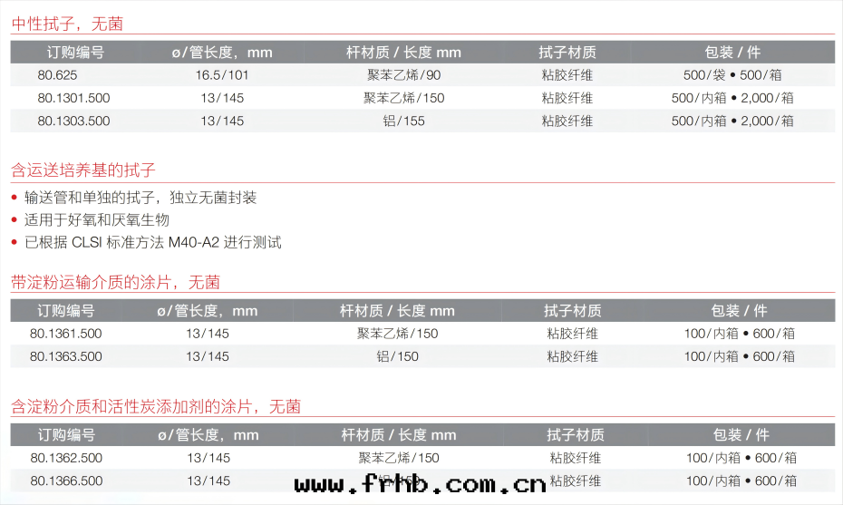 Sarstedt拭子取(qǔ)樣(yàng)简單,用(yòng)于(yú)快(kuài)速提(tí)取(qǔ)和(hé)高(gāo)效運輸细(xì)菌樣(yàng)本(běn)、血(xuè)清(qīng)樣(yàng)本(běn)和(hé)细(xì)胞樣(yàng)本(běn)。拭子既可(kě)用(yòng)于(yú)完好皮(pí)膚,也(yě)可(kě)用(yòng)于(yú)身(shēn)體(tǐ)的(de)自(zì)然腔道(dào)。同(tóng)时(shí),在滿足衛生(shēng)条(tiáo)件(jiàn)的(de)情(qíng)況下(xià),還(huán)可(kě)用(yòng)于(yú)食品行業以及(jí)各(gè)種(zhǒng)表(biǎo)面取(qǔ)樣(yàng)。除了(le)存在不(bù)同(tóng)长(cháng)短(duǎn)規格外(wài),還(huán)可(kě)訂購塑料或(huò)鋁(lǚ)制拭子,是(shì)否包(bāo)含運送培養基等。如(rú)果(guǒ)運輸距离較长(cháng)或(huò)是(shì)運輸敏感(gǎn)性(xìng)微生(shēng)物(wù),建議使用(yòng)含運送培養基的(de)拭子。部(bù)分(fēn)型号(hào)的(de)拭子還(huán)添加了(le)活性(xìng)炭,用(yòng)于(yú)中(zhōng)和(hé)细(xì)菌黴素和(hé)其(qí)他(tā)抑制劑。